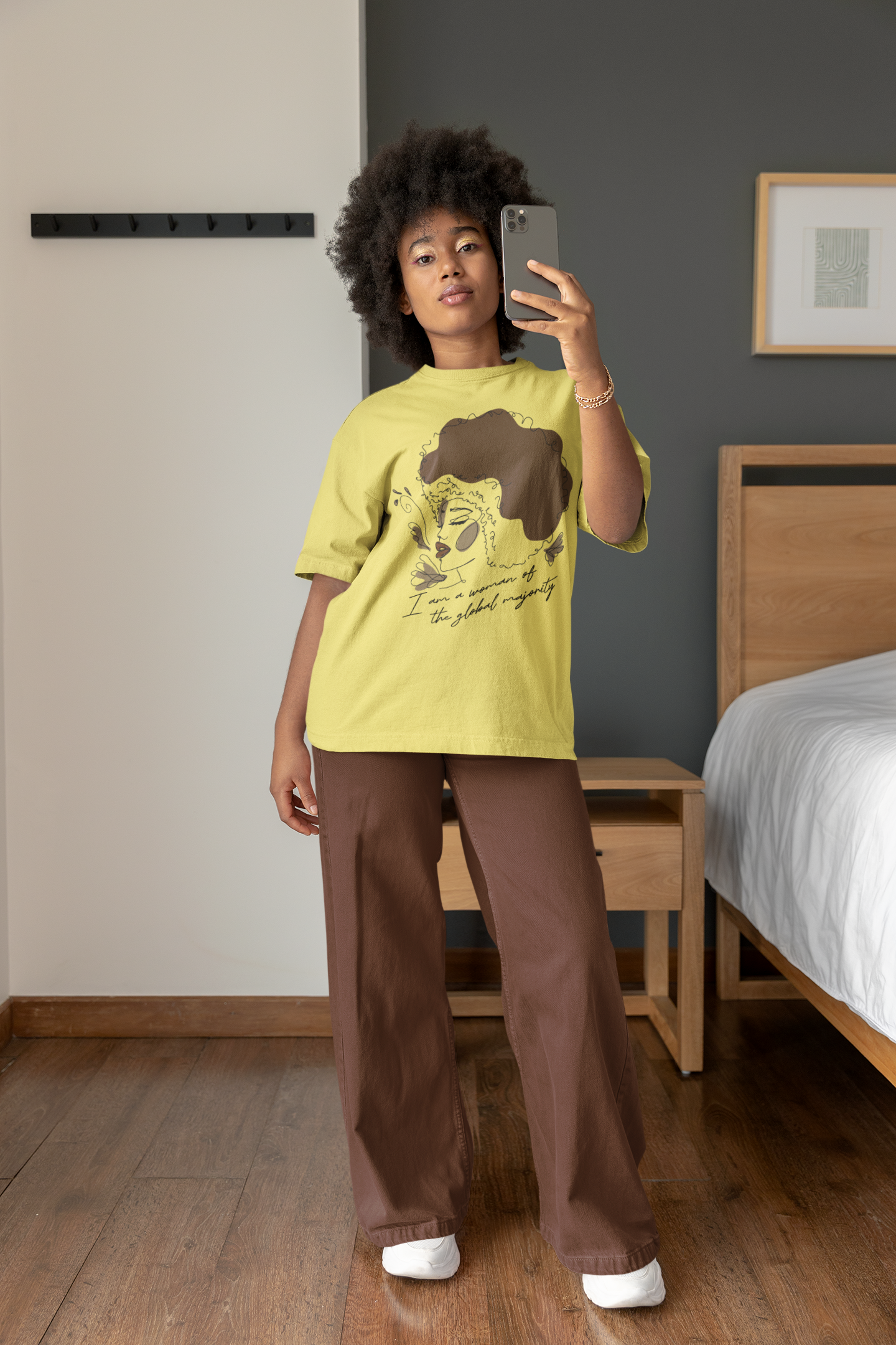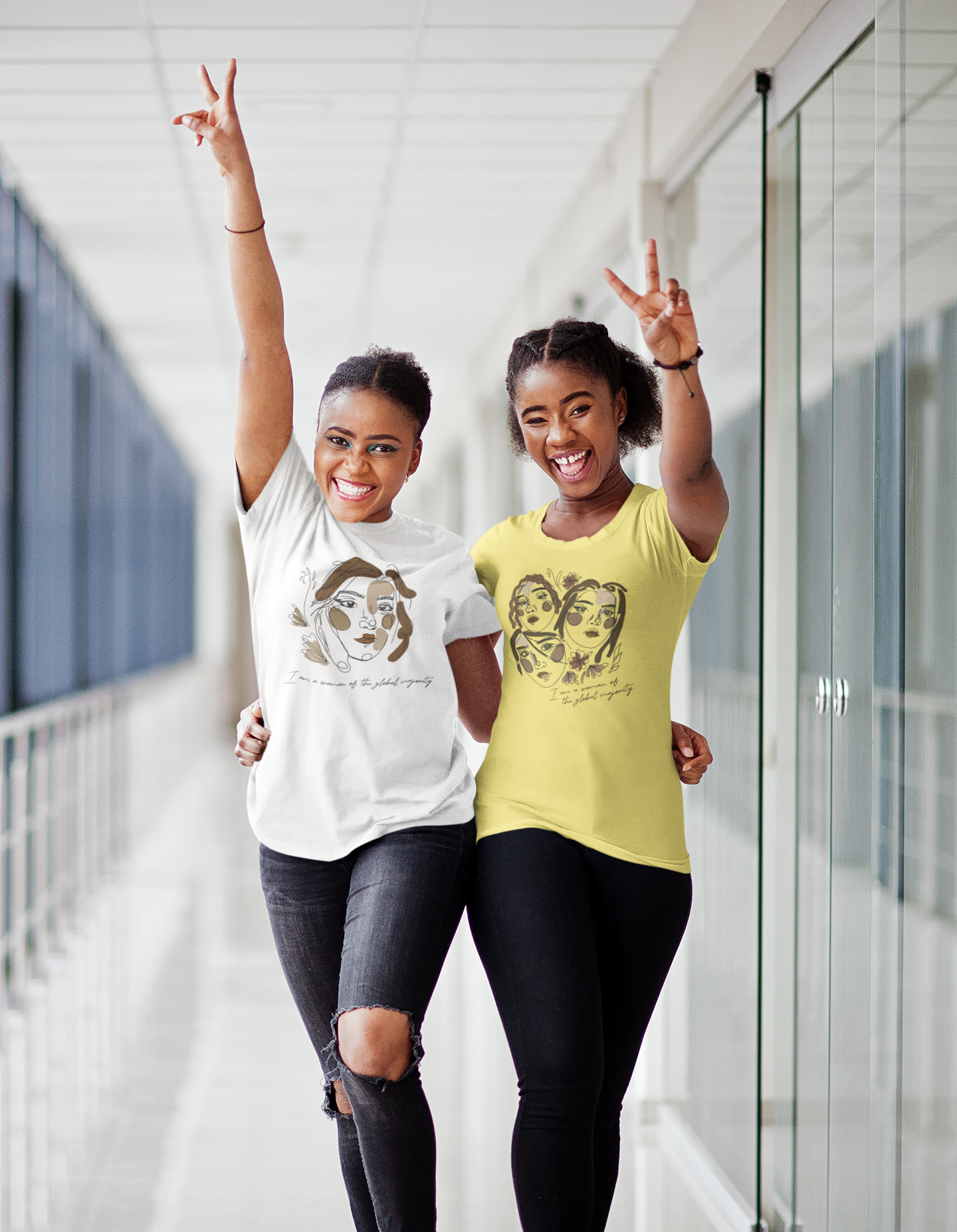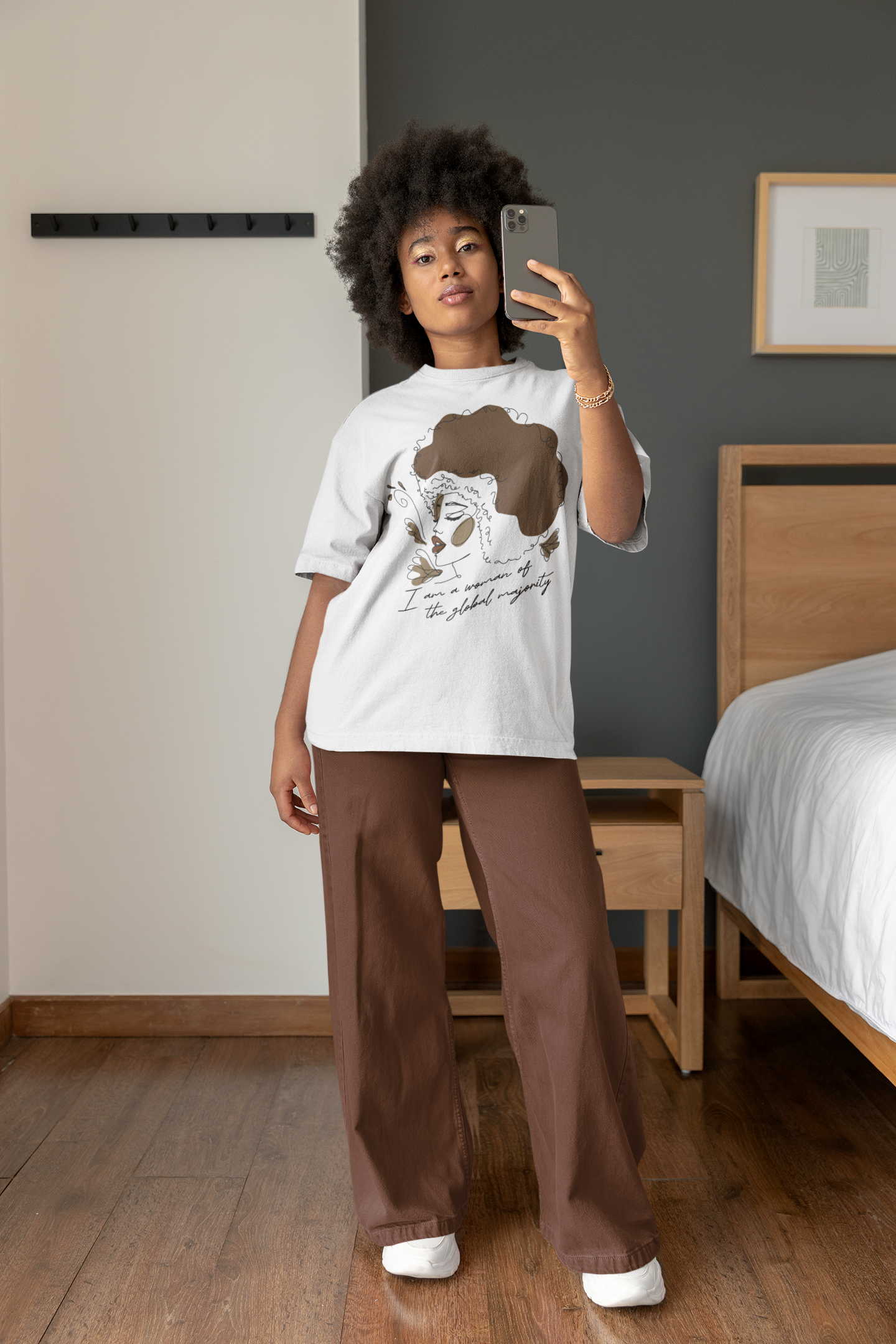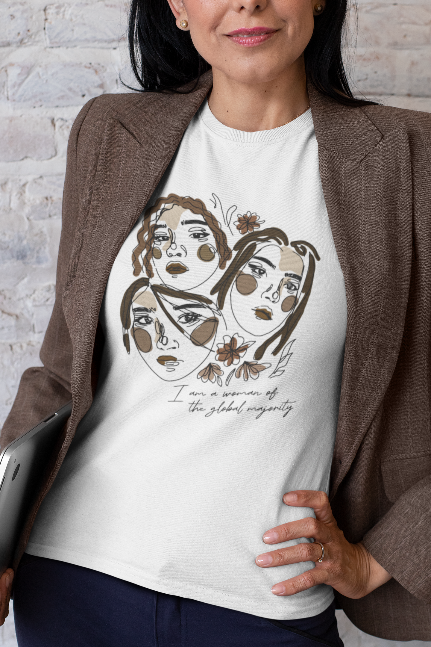 This shirt serves as a powerful statement of representation and empowerment, embodying the strength and beauty of women of the global majority. It is a wearable work of art that encourages inclusivity, celebrates diversity, and sparks conversations about the collective experiences and achievements of these remarkable women.